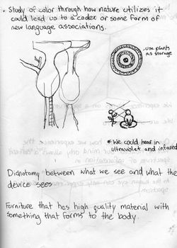 This multi-disciplinary studio uses scenarios, vignettes (Filmic portrait which demonstrates, offers the viewer an essence, atmosphere, possible experience instigated by a designed system) to explore meaningful or emergent social behaviors, exchanges, emotional experiences and living spaces based upon sensing technologies that can interact, influence or redirect our senses to provide value (and) improve how we value our lives/living. Rarely have designers anticipated the full implications of new technologies on the larger culture, the lives of individuals, or the built environment. From the automobile and television to mobile phones and gene sequencers, initial functional intent represents only a small part of the total impact of new technology. In the interest of increasing the potential relevance and impact of new technological capabilities, this project will explore and map territories of linked social, cultural, psychological behavior. The objective of the investigation is to play, reveal, tweak, challenge, interrogate, interpret, abuse, and test the limits of our senses and our adaptive responses to the influence of new technologies.